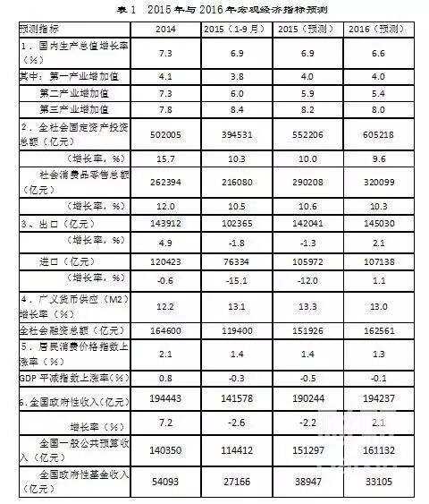 分年度预测2015年与2016年中国宏观经济形势,其预测结果如表1所示。
